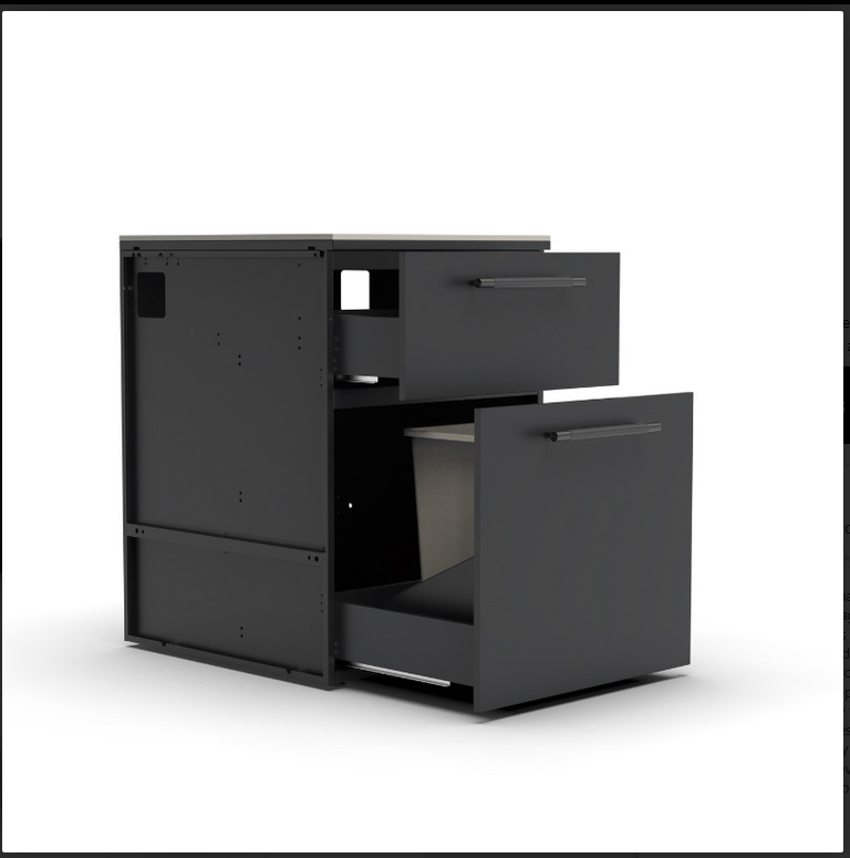 Erweitern Sie Ihre Brabura Outdoorküche mit dem CT 60 Schubladen Küchenmodul. In der unteren Schublade findet ein 40 Liter Mülleimer einen festen Platz, sodass Sie Ihre Küchenabfälle direkt entsorgen können. In der oberen Schublade lässt sich Zubehör wie Handschuhe, Spatel oder Grillzange verstauen und ist schnell griffbereit. Auf der hochwertigen Arbeitsplatte aus Neolith Sinterstein können Sie Ihre Speisen vorbereiten, Zutaten abstellen und vieles mehr. Die porenfreie Oberfläche ist besonders witterungsbeständig und hält Kratzern und hohen Temperaturen mühelos stand. Der robuste Korpus besteht aus pulverbeschichtetem verzinktem Stahl mit Edelstahl-Griffen und Soft-Close-Sliders, zum leisen Schließen der Schubladen.Mit dem CT 60 Schubladen Küchenmodul können Sie Ihre Brabura Outdoorküche mit mehr Stauraum und einer weiteren Arbeitsfläche ausstatten.