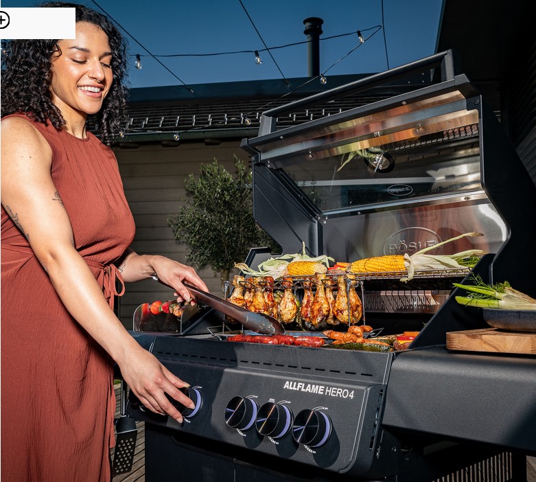 Die zweifarbig beleuchteten Drehknöpfe ermöglichen sicheres Grillen bis in die späte Nacht hinein. Der Deckel des Allflame Hero 4 Deckel verfügt über einen 30% größerem Glaseinsatz und sorgt damit - im Vergleich zur Videro-Serie - für einen noch besseren Einblick in den Garraum. Auf dem großen Deckelthermometer wird die Temperatur des Grills gut lesbar in °C und °F angezeigt. Der Allflame Hero 4 ist überdies mit einem praktischen Besteckhalter ausgestattet und verfügt über einen Gasdruckregler mit integrierter Schlauchbruchsicherung. Das Gehäuse aus pulverbeschichtetem Stahl bietet Stauraum für Gasflaschen bis 11 kg.