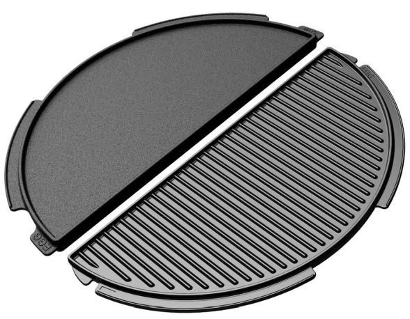 Jede Geschichte hat zwei Seiten. Das gilt auch für die halbrunde Grillplatte aus Gusseisen von Big Green Egg, die verschiedene Zubereitungs- möglichkeiten für unterschiedliche Speisen bietet. Die geriffelte Seite etwa eignet sich hervorragend für feine Fischfilets, Burger oder getoastete Sandwiches. Auf der glatten Seite braten Sie zarte Crêpes, Eier oder backen Blinis und Pfannkuchen. Da diese Grillplatte aus Gusseisen nur die Hälfte des Rostes vom Big Green Egg in Beschlag nimmt, bleibt noch Platz zum Grillen anderer Speisen übrig.