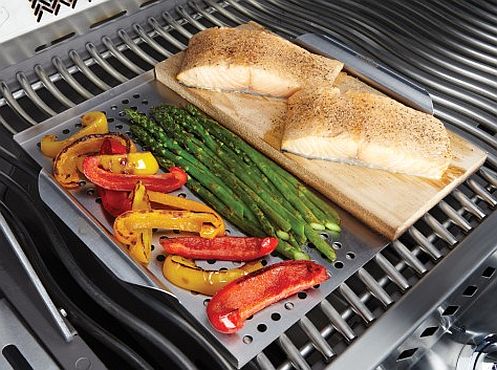 Quadratischer Edelstahl-Gemüsekorb mit seitlichen Griffen zum einfach Anheben inkl. einer Zedernholzplanke zum Räuchern. Auf dem aromatischen Zedernholz lassen sich nicht nur Gemüse, sondern auch Fisch und Fleisch ganz besonders schmackhaft zubereiten.
