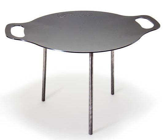 2 in 1: Petromax Grillpfanne und Feuerschale, das Multitalent aus Stahl. Entweder man entfacht ein Lagerfeuer in der Feuerschale, um den darunter liegenden Boden unversehrt zu lassen, oder man stellt die Grillschale mit ihren drei Standbeinen (23 cm) über das offene Feuer, um leckeres Essen zuzubereiten. Der Clou: In der Mitte wird die Schale heißer als am äußeren Rand. Ein saftiges Stück Fleisch gart am Rand nach, während in der Mitte noch das Gemüse brutzelt. Bei jedem Brat- und Brennvorgang bildet sich Patina, die für einen natürlichen Antihafteffekt sorgt. Auch ohne Stand- beine kann die Grillschale in den Größen fs48 und fs56 auf einem Atago verwendet werden. Durch- messer: 56 cm, Gewicht: 7,1 kg, Material: Stahl.
