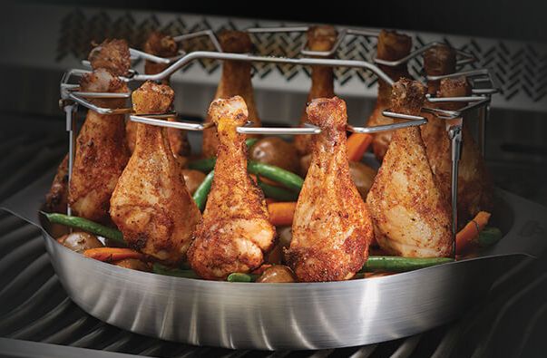 Der Grillhalter für Hähnchenkeulen von Napoleon ist äußerst vielseitig uns kann für die Zubereitung mehrerer Gerichte auf einmal genutzt werden. Bereiten Sie eine köstliche Paella darin zu, gesundes Gemüse oder Meeresfrüchte. Das aufrechte Gestell ermöglicht das gleichmäßige Garen von bis zu 12 aufrecht gestellter Geflügel- keulen. Nutzen Sie die Grillplatte auch als Fettauffangschale oder für die gleichzeitige bzw. separate Zubereitung leckerer Beilagen. Der Grillhalter ist aus Edelstahl gefertigt, beständig, langlebig und spülmaschinenfest. Das Gestell ist klappbar und lässt sich schnell und platzsparend verstauen.