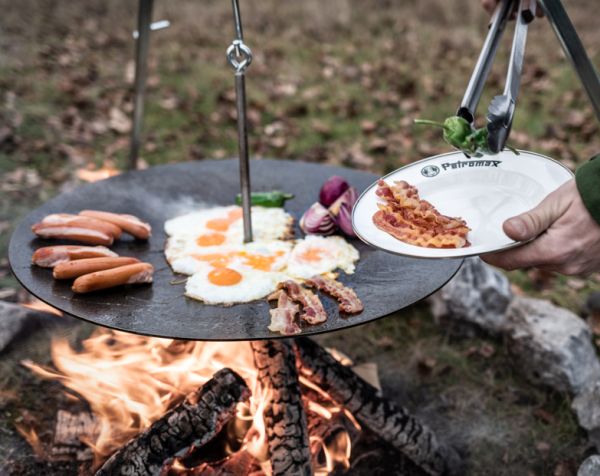 Besonders schonend und geschmackvoll gelingen Burger, Steaks oder Gemüse mit der Hänge-Feuerschale, denn bei dieser hängenden Variante bleiben Speiseflüssigkeiten erhalten. So wird das Fleisch außen knusprig und innen saftig, und Beilagen garen gleichzeitig am Rand mit. Durch die unterschiedlichen Temperaturzonen gelingen mehr- gängige Mahlzeiten, die nicht nur den Hunger auf Abenteuer und offenes Feuer stillen. Oder wie wäre es mit einem deftigen Pfannengericht mit Brat- kartoffeln, Bohnen und Spiegelei? Auch das ist kein Problem, denn mit 56 cm Durchmesser bietet dir und deinen Freunden die Hänge-Feuerschale ausreichend Raum für jedes Gericht.