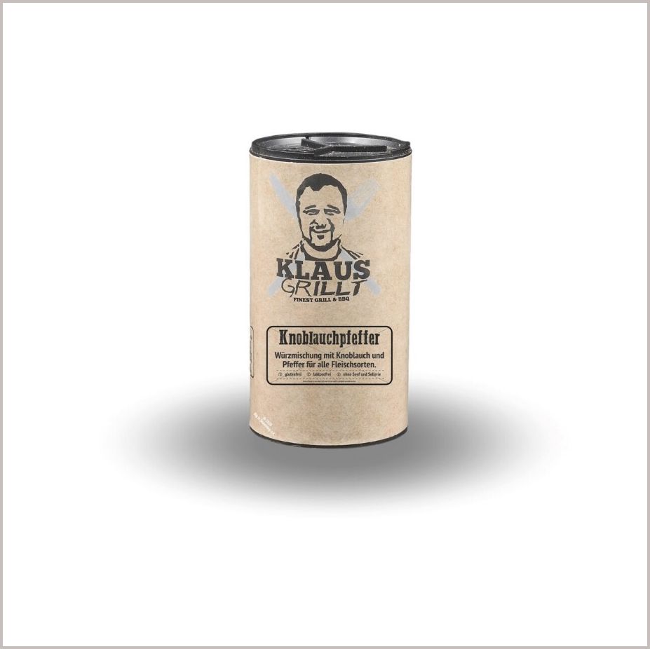 Klaus Grill(t)pfeffer “Knoblauch” von Klaus persönlich kreiert - bekannt vom Youtube Kanal “Klaus grillt”, ohne allergene Zutaten, E-Nummern, Extrakte, Aromen und Geschmacksverstärker. Eine sehr harmonische Mischung aus Knoblauch und Pfeffer. Abgerundet wird das ganze harmonisch durch Liebstöckel und Muskatblüte. Wie alle Produkte der Gewürzmanufaktur sind natürlich auch die Produkte von Klaus ohne Zusatzstoffe oder Allergene. Nach Geschmack zum Würzen benutzen.