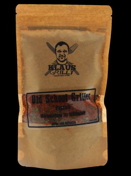 Old School Griller „Paprika" Rub, bekannt durch den Youtube Kanal “Klaus grillt”. Die leckere Gewürzmischung enthält eine ordentliche Portion Paprika abgerundet mit Petersilie, Knoblauch, Zwiebel und weiteren deftigen Gewürzen. Ohne allergene Zutaten, E-Nummern, Extrakte, Aromen und Geschmacksverstärker, auch für die vegane Küche geeignet. Für 1 kg Fleisch 30-40 g der Würzmischung in 100 ml Wasser geben. Dann das Fleisch solange mischen, bis das Wasser  aufgenommen wurde. Das Fleisch 1 bis 6 Stunden an einem kühlen Ort abgedeckt marinieren und nach Belieben braten oder grillen.