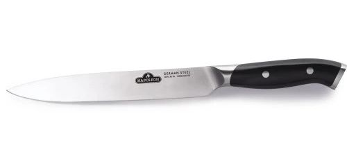 Rasiermesserscharfes, solides Tranchiermesser, gefertigt aus deutschem Stahl und mit auszeichneter Schnitthaltigkeit. Mit diesem Messer gelingt das mühelose und ganz präzise Schneiden von Fisch, Fleisch und Gemüse in hauchdünne Scheiben. Aber natürlich kann man damit auch Braten, Geflügel, Schinken und weitere größere, gegarte Fleischsorten perfekt in gleichmäßige Scheiben schneiden. Der doppelt genietete, durchgehende Griff sorgt für Griffigkeit und liegt gut und sicher in der Hand. Die Klinge ist 20 cm lang..