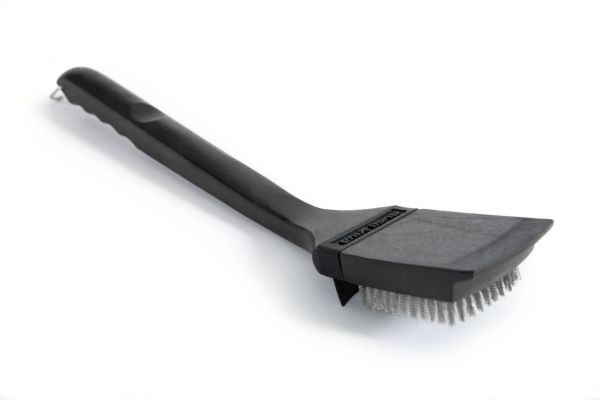 Reinigungsbürste aus Holz, Borsten aus Edelstahl gefertigt.Der integrierte Spritzschutz verhindert, dass beim Abbürsten der Grillroste Schmutz in Ihre Richtung spritzt.