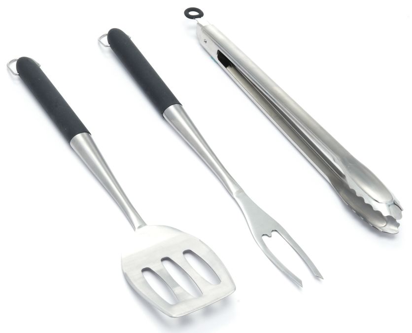 Das formschöne, 3-teilige Edelstahl-Besteckset ist beim Grillen unverzichtbar. Ds Set besteht aus Zange, Wender und Fleischgabel.