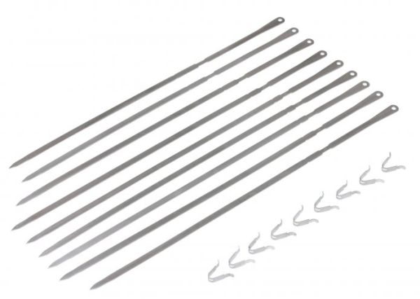 Edelstahl-Spieß-Set, bestehend aus 9 Stück, mit einer Länge von 74 cm - für einen noch vielseitigeren Monolith-Grill LeChef, auf dessen Rotisserie damit mehrere Köstlichkeiten zeitgleich zubereitet werden können.