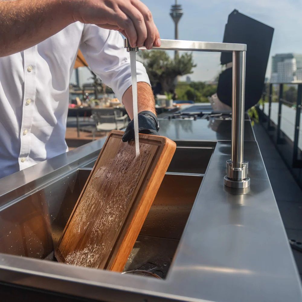 Erweitere Deinen G32 mit dem S32 Spülmodul und kreiere Deine persönliche Outdoor-Küche. Module und Grills sind perfekt aufeinander abgestimmt. Dadurch garantieren wir einen stimmigen Look für Deine Outdoor-Küche. Alles an einem Ort: Zu einer richtigen Outdoor-Küche gehört natürlich auch eine Spüle. Diese liefern wir Dir mit dem S32 Modul und der integrierten Spüle inklusive Frontblende. Schwarz pulverbeschichteter Edelstahl sorgt für Langlebigkeit und ein ansprechendes Design. Die schwarze Pulverbeschichtung sieht edel aus und hält Wind und Wetter stand. Benötigst Du die Spüle mal nicht, kannst Du sie mit der mitgelieferten Abdeckung abdecken und für andere Zwecke nutzen. Egal, für welches S32'' Modell Du Dich entscheidest - Schubladen oder Türen oder Frontblende - alles lässt sich sanft durch das SoftClose-System schließen.