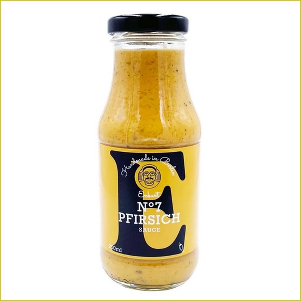 Eckarts Saucen werden in ehrlicher Handarbeit von ihm und seinem Team frisch gekocht und nicht auf Halde produziert. Jede Flasche geht mindestens einmal durch seine Hände, bevor das Etikett draufgeklebt wird. "Auf jeder Flasche steht sein Name", sagt er. "Das verpflichtet, und dafür stehe ich gerade." Die einzigartige Qualität seiner Saucen schmeckt man, besonders bei den Saucen mit viel Fruchtanteil wie seiner viel gerühmten Pfirsich-Senf-Sauce. Dabei handelt es sich um eine fruchtige Saucenkreation mit deftigem Senfaroma, leichter Schärfe und dezenter Hickorynote im Abgang. Perfekt auf Burgern, zu Pulled Pork, Lachs, Würstchen, Huhn, Nacken und und und ... Flascheninhalt 250 ml.
