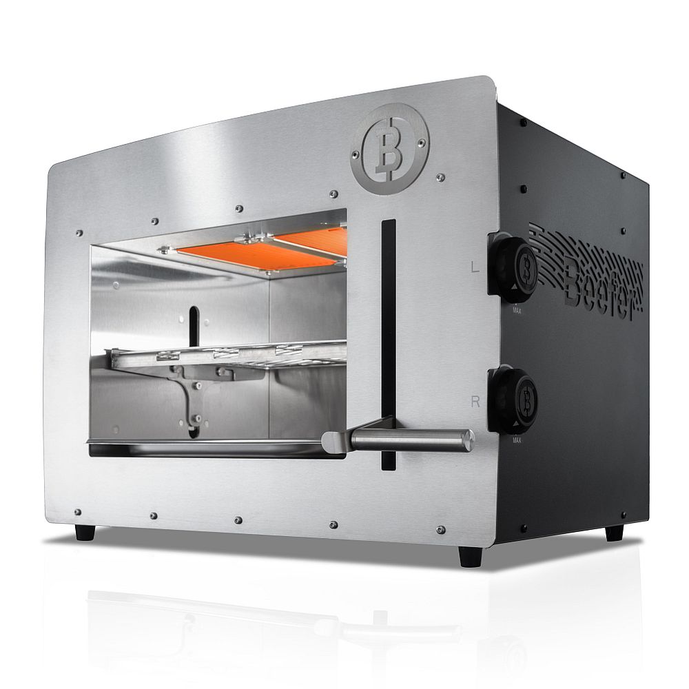 Gratinier-Express: Der E-Beefer XL ist von der besonders schnellen Sorte. Während dein Backofen locker bis zu 20 Minuten braucht, bis es so weit ist, dass aus Käse etwas Essbares wird, schafft es der E-Beefer in rund 5 Minuten (abhängig von Umgebungstemperatur) auf mindestens 800 Grad Celsius. Und die nicht im Brenner, sondern im oberen Garraum, so wie es sich gehört für einen echten Beefer. Na dann mal eine Handbreit Käse unterm Brenner! Die beiden Brenner sind übrigens separat regelbar – so hast Du auf Wunsch eine 800-Grad-Knusperzone und zum Beispiel eine ‘Sizzle Zone’ bei nur 400 oder 300 Grad.