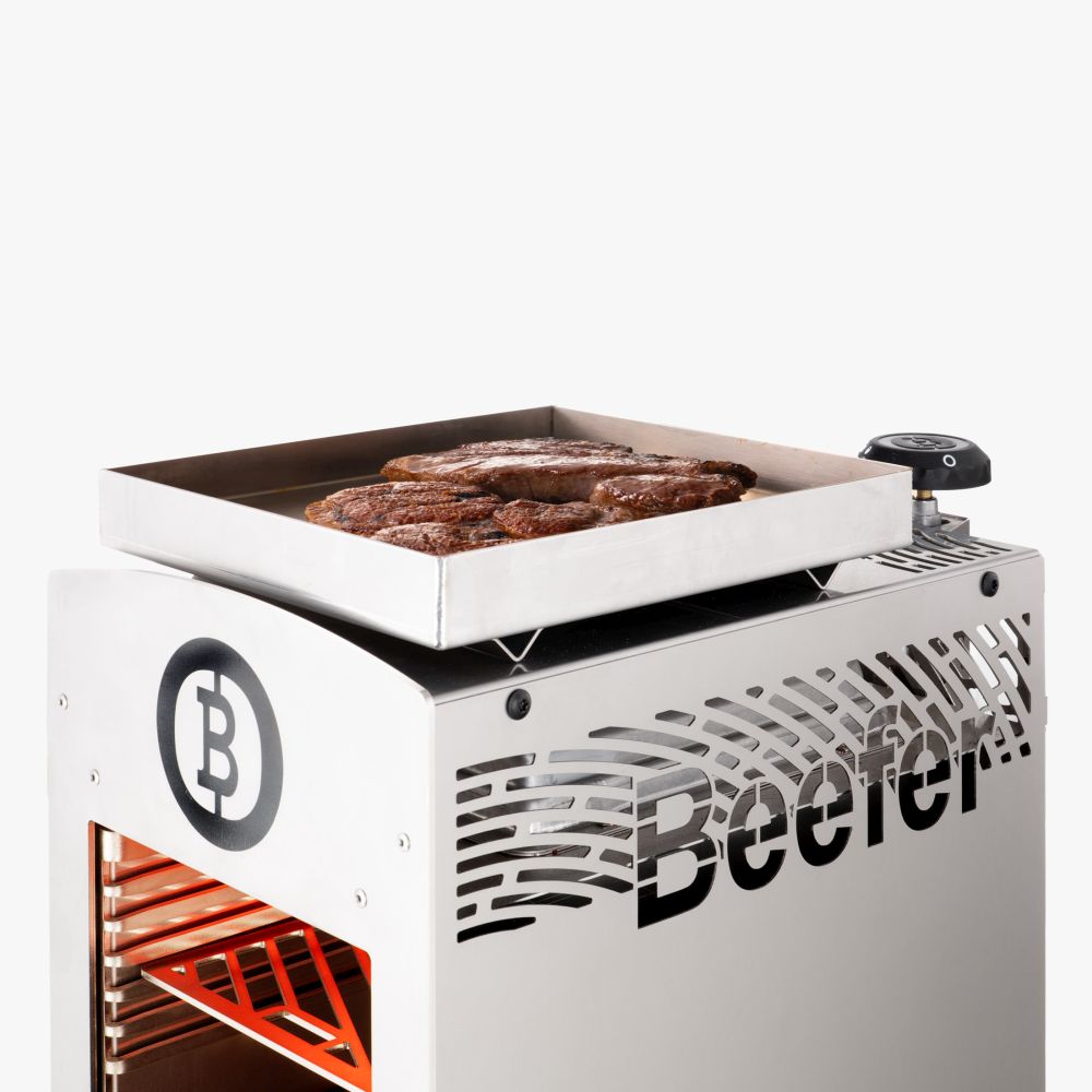 – und zwar unsere Warmhalteschale bzw. Warmwerdeschale, in der Du z.B. rohes Beef aus dem Kühlschrank langsam auf Temperatur bringen kannst oder gebeeftes Fleisch ruhen lassen kannst. Häufig (natürlich nicht bei 10 Grad minus) erreicht das Fleisch die ideale Kerntemperatur. Diese sagenhaft stabile Schale aus Edelstahl findet ihren Platz auf der Oberseite Deines Beefer One · One Pro · One Chef. Die Schale ruht auf sehr stabilen Abstandhaltern, die die ideale Distanz zum Außengehäuse des Beefers herstellen. Natürlich in bester und rostfreier Qualität